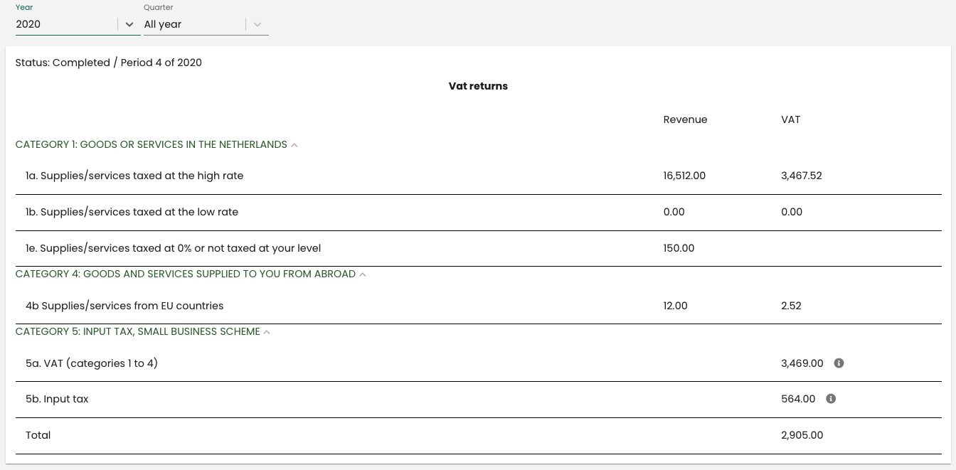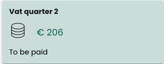 How much VAT you have to pay over your income from the past quarter can be found in two places. On your dashboard in the box 'VAT quarter' or via the 'VAT returns' in the green bar on the left under 'reports'.